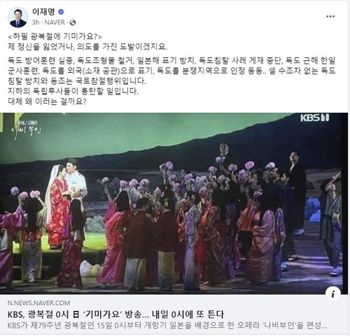 더불어민주당 이재명 전 대표가 15일 KBS에서 기미가요가 연주되는 오페라 ‘나비부인’이 방영됐다는 보도에 “제 정신을 잃었거나, 의도를 가진 도발”이라고 강하게 비판했다.
