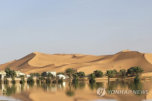 모로코 남동부에 내린 폭우로 생긴 호수에 오아시스의 모습이 비친 모습. [AP=연합뉴스]