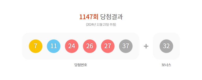 (주)동행복권 측은 제 1147회 로또추첨 결과 1등 당첨번호는 '7, 37, 11, 26, 24, 27', 2등 보너스번호는 '32'번