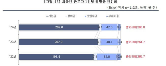 조사 결과 외국인 1인당 올해 평균 인건비는 263만8000원으로 집계됐다. 2022년(265만7000원), 2023년(274만7000원)에 비해 소폭 감소했지만 기본급은 194만4000원, 207만원, 209만원으로 매년 올랐다. 총 인건비가 감소한 건 경기 침체로 공장 가동 시간이 줄어들며 잔업수당이 감소한 탓이다. 같은 기간 잔업수당은 52만8000원, 48만1000원, 42만5000원이다. 응답자의 57.7%가 "외국인 근로자가 내국인 이상 받는다"고 답했다.