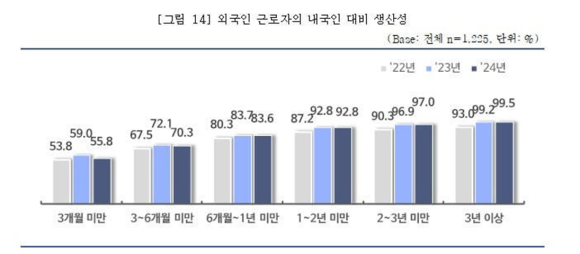 사업주들이 느끼는 외국인 근로자의 업무 숙련도는 낮은 것으로 나타났다. 내국인의 생산성을 100으로 가정했을 때 입사 3개월 미만의 외국인 근로자 생산성은 내국인의 55.8% 수준에 불과한 것으로 조사됐다. 응답자 전원은 "낮은 생산성으로 인해 외국인 근로자에 대한 수습기간이 필요하다"고 답했다. 수습기간은 3.7개월이 적당한 것으로 나타났다.