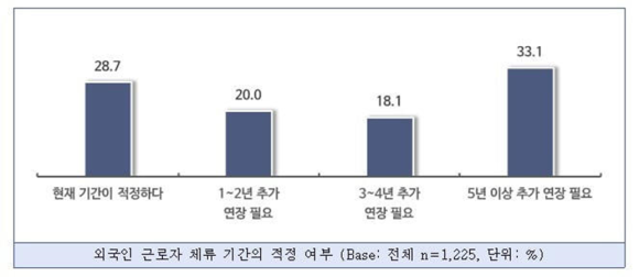 외국인 근로자 도입 규모 관련해서는 현재 규모를 유지하되 체류 기간을 늘리는 것을 희망하는 것으로 나타났다. 내년도 외국인력 도입 규모에 대한 의견으로는 ‘올해 수준 유지’가 65.2%로 가장 많았다. 외국인 근로자의 체류 기간(최장 9년 8개월)이 적정한지에 대해 묻는 질문에는 ‘5년 이상 추가 연장’이 필요하다는 의견이 33.1%로 가장 많았다.
