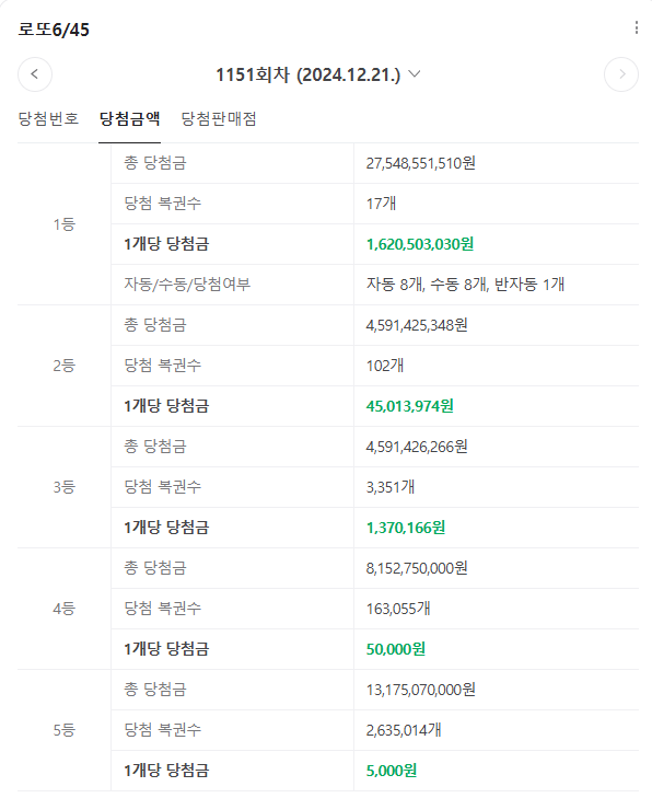 로또복권당첨번호 6개 숫자를 모두 맞힌 1등 당첨자는 총 17명으로 1인당 16억2천50만원을 받는다.