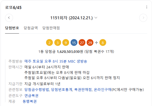 1151회 로또 1등 당첨번호조회 결과 전국 총 17명…1인당 당첨금 16억 여원