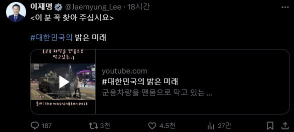 12월 22일 이 대표는 자신의 엑스(X·구 트위터) 계정에 “이분 꼭 찾아주십시오”라면서 한 유튜브 쇼츠 영상을 공유했다.