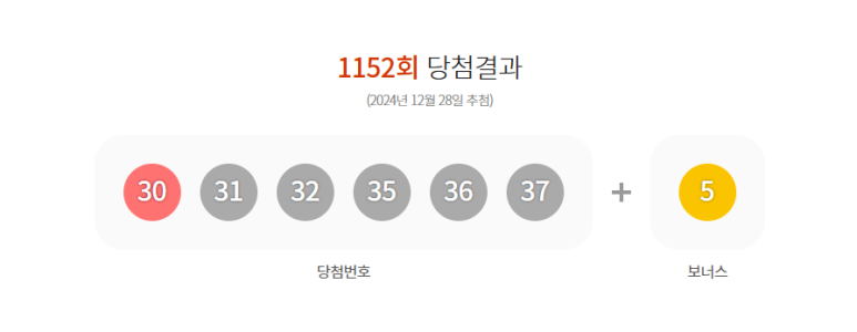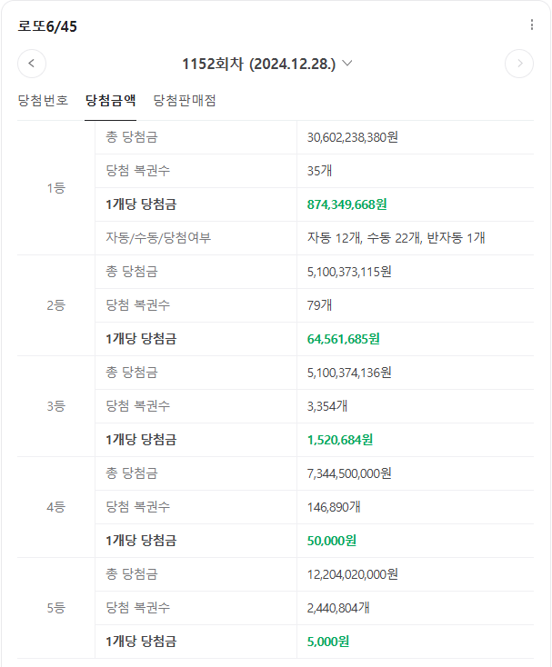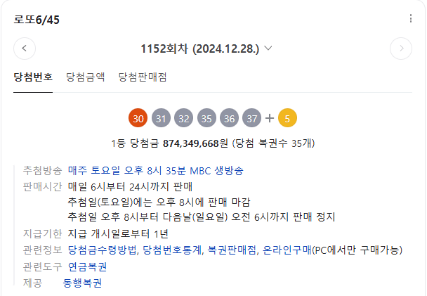 2024년 마지막 로또 1152회 추첨에서 총 35명의 1등 당첨자가 나오며, 1인당 8억7천여만원의 당첨금 행운을 가져갔다.