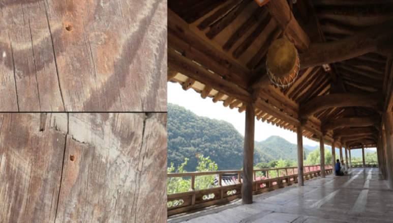 (왼쪽부터) 세계문화유산 병산서원 만대루 기둥에 남은 못자국, 안동 병산서원 만대루 / 사진=경북 안동시, 연합뉴스