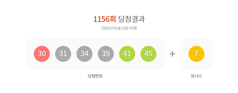 (주)동행복권 측은 제 1156회 로또추첨 결과 1등 당첨번호는 '45, 39, 34, 41, 30, 31', 2등 보너스번호 '7'번