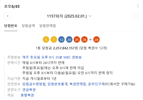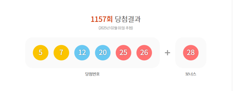 (주)동행복권 측은 제 1157회 로또추첨 결과 1등 당첨번호는 '5, 7, 20, 26, 25, 12', 2등 보너스번호는 '28'번
