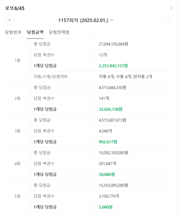1157회 1등 로또복권의 구매 방식은 자동 6개, 수동 4개, 반자동 2개다.