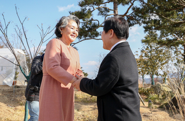 김정숙 여사가 지난달 30일 경남 양산시 평산마을 문재인 전 대통령 사저를 방문한 더불어민주당 이재명 대표와 인사하고 있다. 연합뉴스