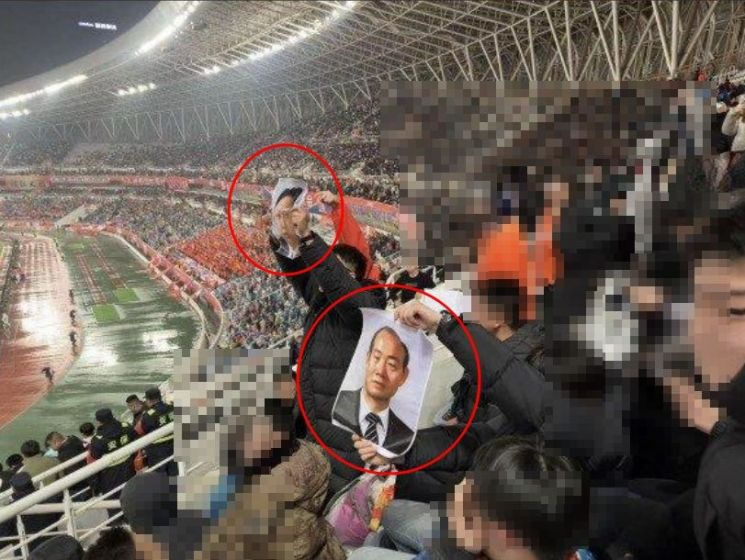 사진에는 산둥 팬들이 경기 도중 원정 응원단석을 향해 전두환 전 대통령과 북한 김일성 주석, 김정은 국무위원장 등의 사진을 펼쳐 보이는 모습이 담겼다.