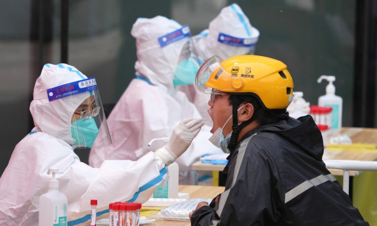 지난 2022년 5월 5일 중국 수도 베이징 차오양구에서 한 의료인이 코로나19 검사를 위해 주민에게서 검체를 채취하고 있다. 신화연합뉴스