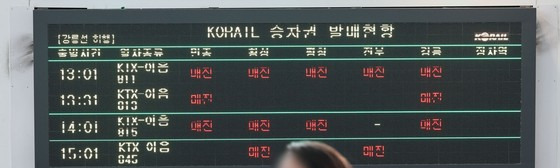 추석 연휴 첫날인 지난해 9월 14일 서울역 내 승차권 발매현황 전광판에 매진이 표시되고 있다. 연합뉴스