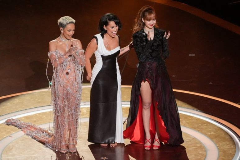 3월 2일(현지 시각) 미국 돌비극장에서 열린 제97회 아카데미 시상식 무대에 오른 도자캣(왼쪽부터), 레이, 리사./ AP연합뉴스