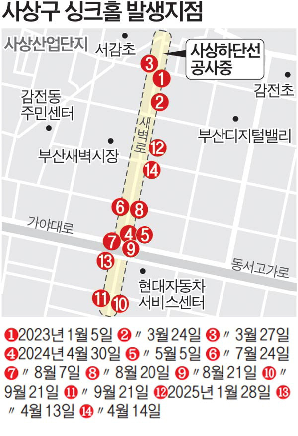 지난해 2024년 9월 21일 사상구 학장동 도로 양방향 2곳에서 싱크홀이 발생했으며, 당시 이곳에 주차된 트럭 2대가 동시에 빠질 만큼 침하 크기가 컸다. 공사 현장 주변 땅꺼짐은 2023년 3차례, 지난해 8차례, 올들어서는 3차례 발생했다.