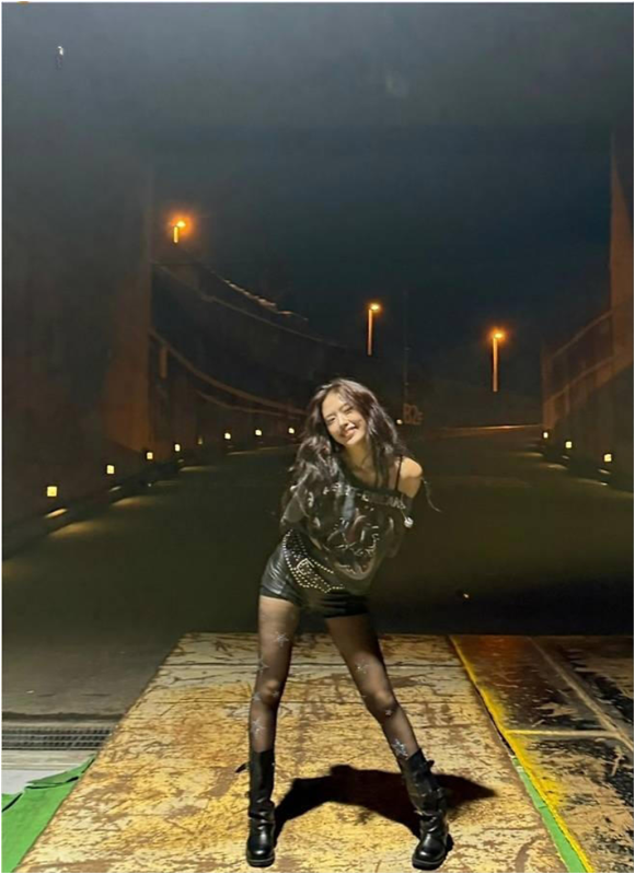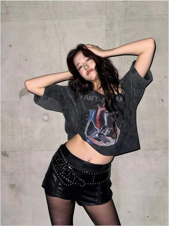 이날 안유진은 블랙 하트 그래픽이 인쇄된 빈티지 티셔츠를 과감하게 한쪽 어깨로 흘러내리게 연출했고, 하이웨이스트의 스터드 장식 가죽 핫팬츠로 센슈얼한 스트리트 무드를 완성했다. 여기에 반짝이는 패턴이 새겨진 시스루 스타킹과 두툼한 벨트가 더해져 룩 전체에 록시크한 텐션을 더했다.