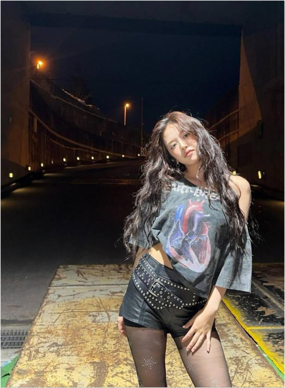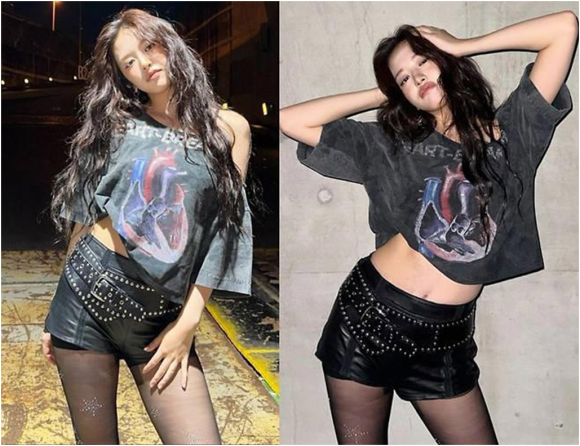 이날 안유진은 블랙 하트 그래픽이 인쇄된 빈티지 티셔츠를 과감하게 한쪽 어깨로 흘러내리게 연출했고, 하이웨이스트의 스터드 장식 가죽 핫팬츠로 센슈얼한 스트리트 무드를 완성했다. 여기에 반짝이는 패턴이 새겨진 시스루 스타킹과 두툼한 벨트가 더해져 룩 전체에 록시크한 텐션을 더했다.