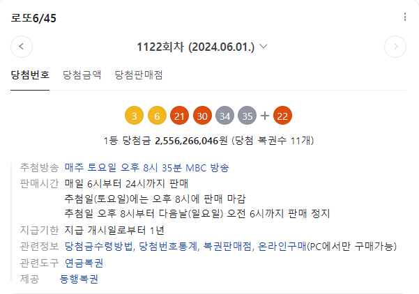동행복권에 따르면 6월 1일 추첨한 제1122회 당첨번호는 3, 6, 21, 30, 34, 35 이며, 2등 보너스 번호는 22이다.