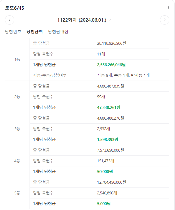 제 1회부터 제 1122회까지 총 판매금액은 75조 6,008억 5,080만원, 총 당첨금액은 37조 8,004억 2,540만원이다.