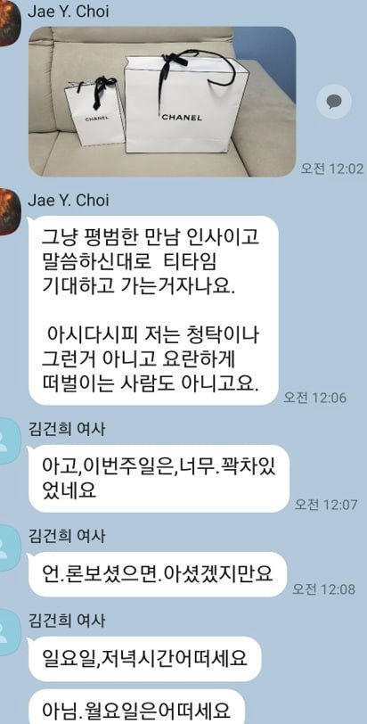 윤석열 대통령 부인 김건희 여사에게 명품 가방을 건넨 최재영 목사가 2022년 6월 김건희 여사와 처음 만날 약속을 잡을 당시 메신저로 명품 화장품을 선물로 준비했다면서 샤넬 브랜드 로고가 새겨진 종이가방 사진을 보낸 것으로 나타났다.