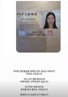 위조된 신분증을 공개한 이주미는 "생년월일을 제외한 모든 정보가 허위이고 위조된 사진"이라며 "저도 손이 덜덜 떨리는데 피해자분은 오죽하실까 싶다. 추가적인 피해 방지차 동의를 받고 사진을 올린다. 경계하고 조심하시길 바란다"고 강조했다.