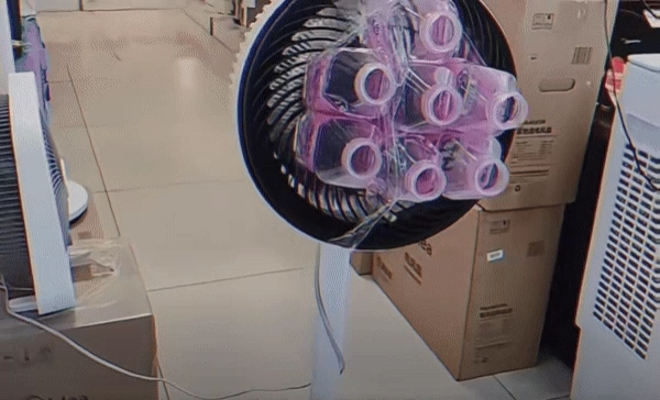 영상에서는 "만드는 방법은 쉽다. 일단 페트병 여러 개가 필요하다"며 "입구 쪽을 잘라 모아 선풍기 바람이 나오는 쪽에 고정하면 된다"고 했다.