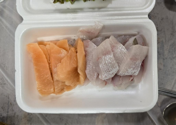 A씨가 올린 사진을 보면, 냉동 연어와 잿방어가 각각 10점 남짓으로 작은 일회용 접시에 담겨있는 것이 보인다.