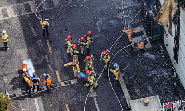 6월 24일 오후 경기도 화성시 서신면 소재 리튬전지 공장 화재 현장에서 구조대원들이 사고 수습 작업을 벌이고 있다.