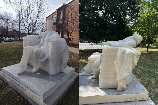 공개된 사진을 보면, 꼿꼿한 자세로 앉아 있던 링컨 조형물이 녹아 고개가 뒤로 완전히 젖혀졌다.