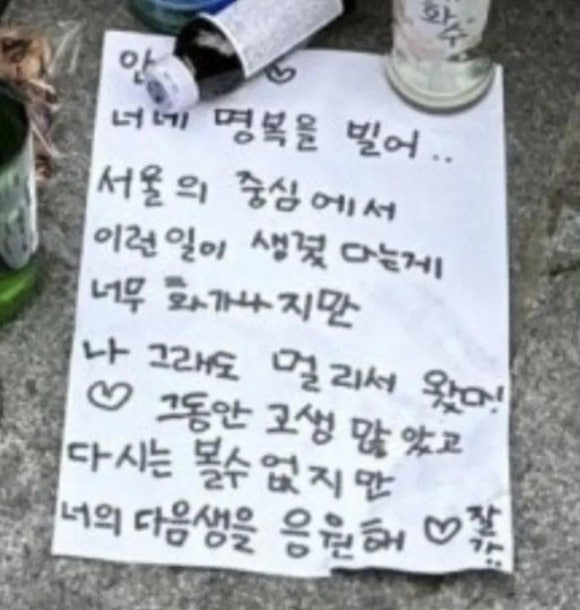 앞서 지난 3일 추모 공간에선 참사 희생자를 조롱하는 취지의 글이 담긴 쪽지가 남겨져 파문이 일었다. 이 종이엔 "XXXXX가 돼 버린 (희생자) 분들의 (명복을) 빕니다"라고 적혀 있었다.