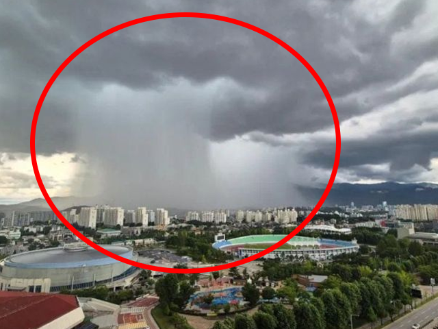 사진에는 원주시 명륜동 원주종합운동장 뒤편에 폭우가 쏟아지는 모습이 담겼는데, 하늘에 비구름이 넓게 펼쳐져 있는 가운데 일부 지역에만 비가 쏟아지는 국지성 호우의 모습을 확인할 수 있다.