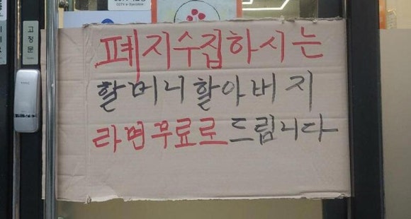 작성자는 “우리 동네 특성상 폐지 줍는 어르신들이 많다”며 “오늘 길을 걷고 있는데, 한 식당에 폐지를 줍는 어르신들에게 라면을 무료로 제공한다는 푯말이 붙어있었다”고 설명했다.