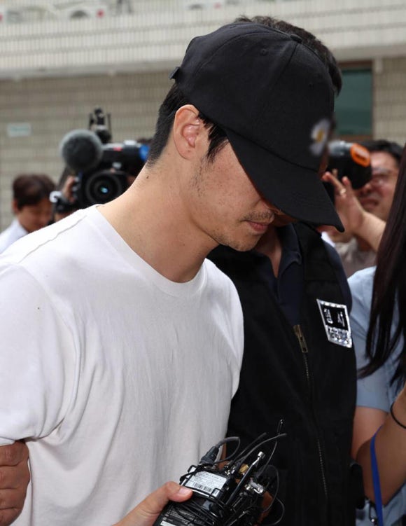 뉴스1 등이 공개한 사진에 따르면 A 씨는 슬리퍼를 신은 채 등장했다. 양손은 수갑으로 채워져 결박됐다. 검정색 모자를 푹 눌러쓴 채 얼굴을 감춘 모습이었다.