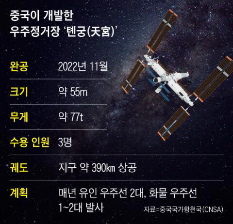 ISS가 유일한 우주정거장은 아니다. 중국은 독자 개발한 우주정거장 ‘톈궁(天宮)’을 운영 중이다. 2022년 11월에 실험실 모듈을 결합시켜 T자형의 우주정거장 기본 구조를 완성했고, 중국인 우주비행사들을 주기적으로 보내고 있다. 규모는 ISS의 3분의 1 정도이지만, 중국 정부는 현재 3개 모듈에 3개를 추가해 총 6개 모듈로 톈궁을 확장할 계획이다. 또 매년 유인 우주선 2대, 화물 우주선 1~2대를 톈궁으로 보내 과학 실험 등을 이어갈 예정이다.