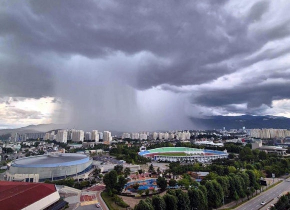 사진에는 원주종합운동장 건너편 명륜1동 남산공원 일대에 폭우가 쏟아지는 모습이 담겨 있었다.