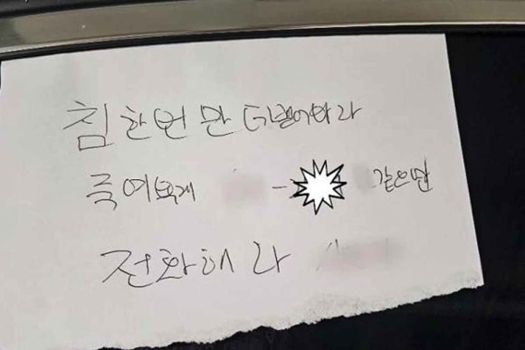 해당 글에는 흰색 BMW 차량이 주차 공간이 아닌 곳에 주차된 사진이 포함돼 있었다. 차량 창문에는 “침 한 번만 더 뱉어봐라. 죽여버리겠다.”라는 욕설과 함께 연락처가 적힌 메모가 붙어 있었다.