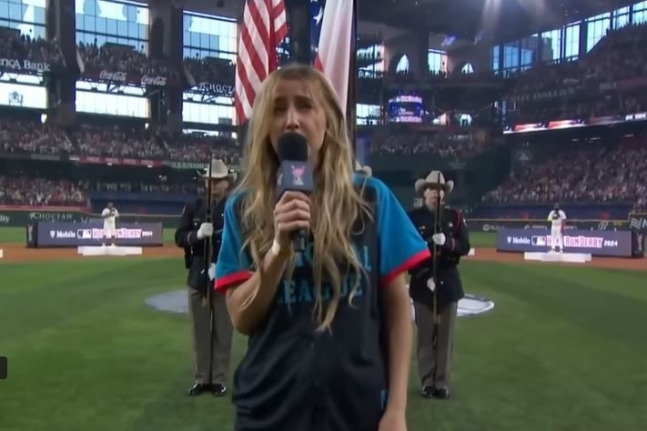 미국 컨트리 싱어송라이터 잉그리드 앤드레스(32)는 지난 7월 15일 오후 텍사스주 알링턴 글로브 라이프 필드에서 열린 올스타전 전야제 홈런더비 경기에 앞서 국가를 불렀다.