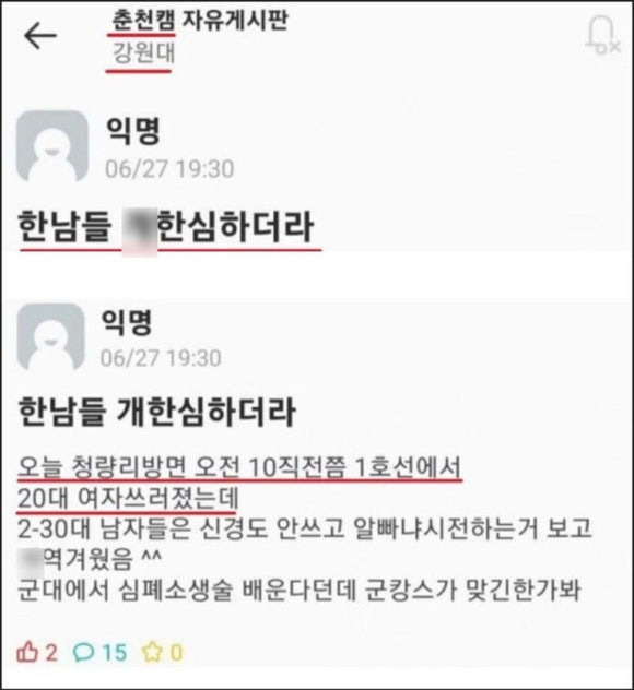 글쓴이는 지난달 17일 올린 글에서 “오늘 오전 10시 직전쯤 청량리 방면 1호선에서 20대 여자가 쓰러졌는데 20, 30대 남자들이 신경도 안 쓰고 ‘알빠냐’(알 바 아니다)를 시전했다. 보고 역겨웠다. 군대에서 심폐소생술 배운다던데 ‘군캉스’가 맞긴 하나 보다”라고 말했다.