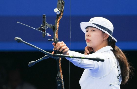 대한민국 양궁 대표팀 임시현 선수가 3일 오후(한국시간) 프랑스 파리 앵발리드에서 진행된 양궁 여자 개인 금메달 결정전 대한민국 남수현과의 경기에서 활시위를 당기고 있다. 뉴스1
